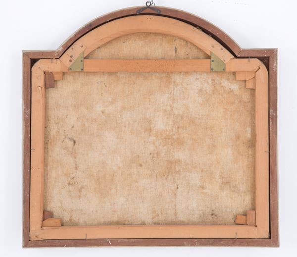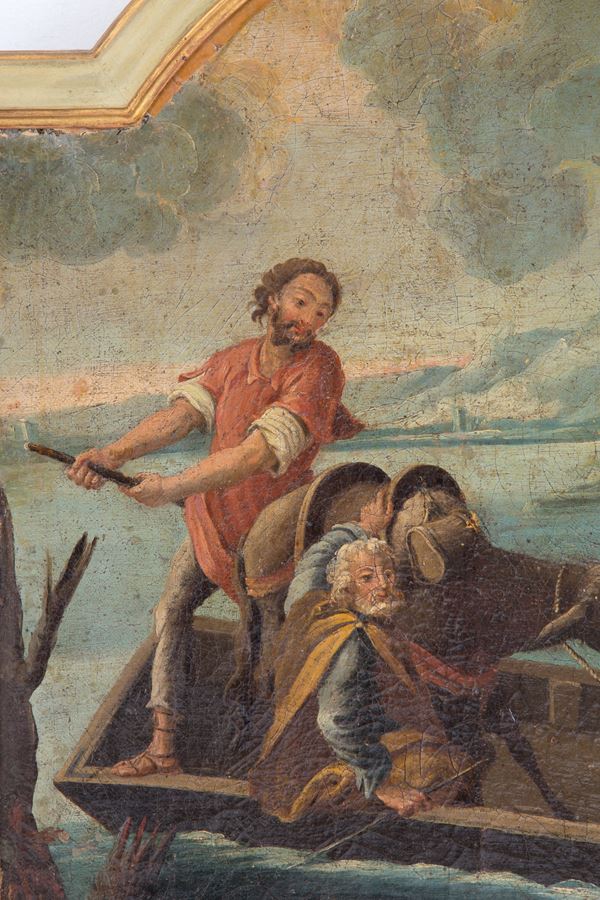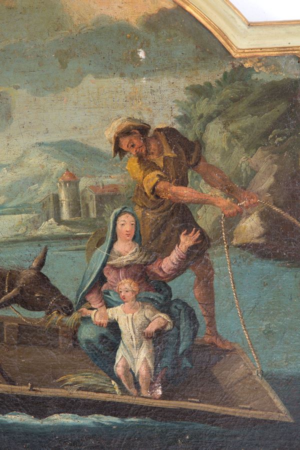 Dipinto olio su tela raffigurante "LA FUGA IN EGITTO". XVIII secolo. In cornice. Difetti e restauri. Già rintelato e rintelaiato.