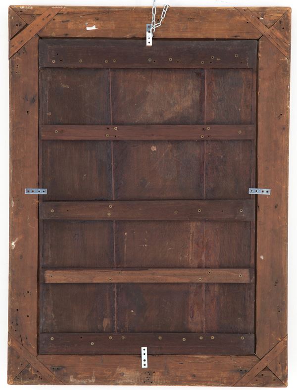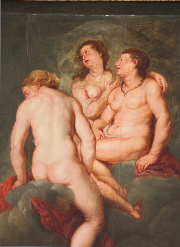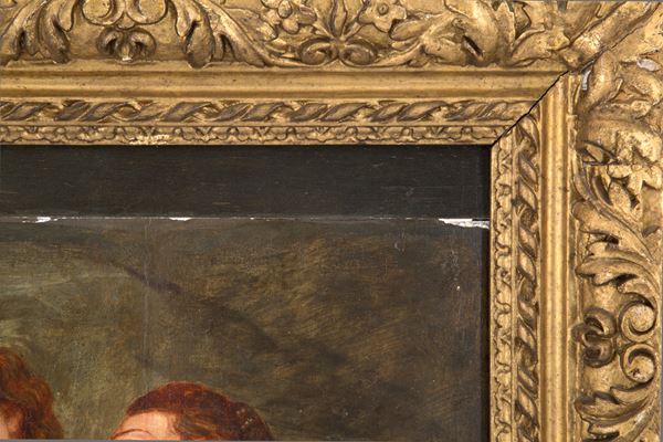 Dipinto olio su tavola raffigurante "LE TRE GRAZIE". XIX secolo. In cornice intagliata e dorata. Difetti e restauri.