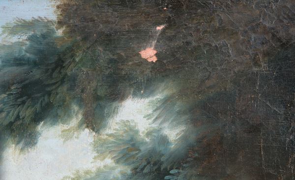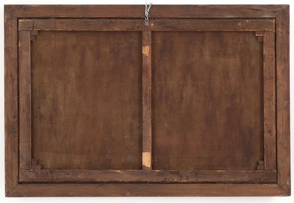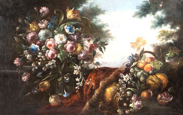 Dipinto olio su tela raffigurante "NATURA MORTA E VASO DI FIORI". XIX secolo. In cornice in legno laccato e dorato. Difetti e restauri.