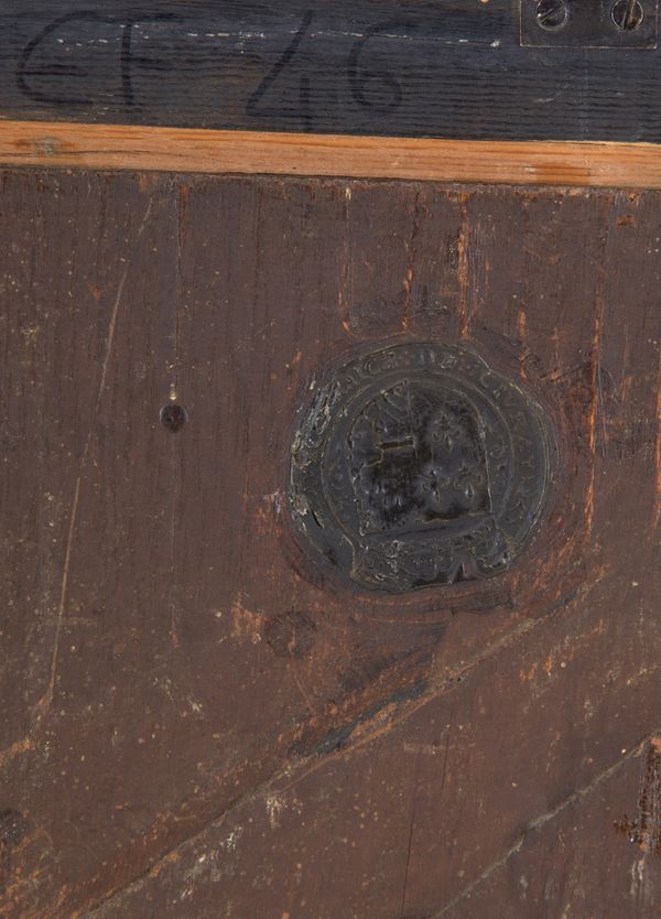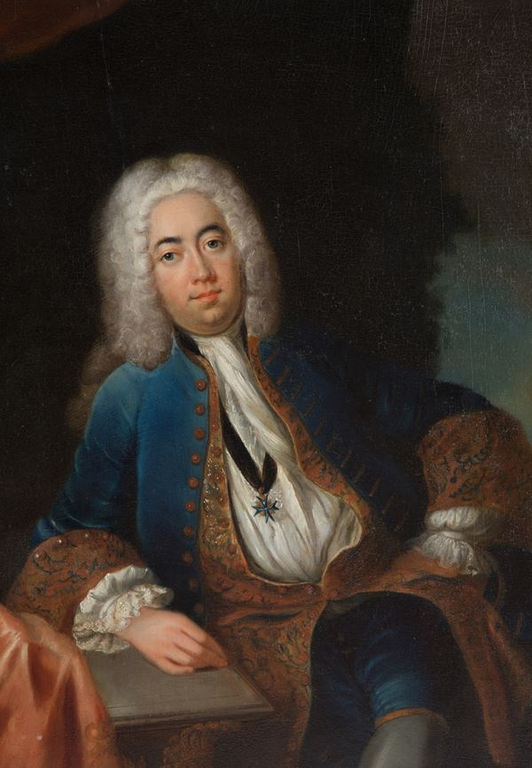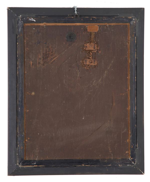 Dipinto olio su tavola raffigurante "NOBILUOMO". XVIII secolo. In cornice in legno laccato e dorato. Restauri.