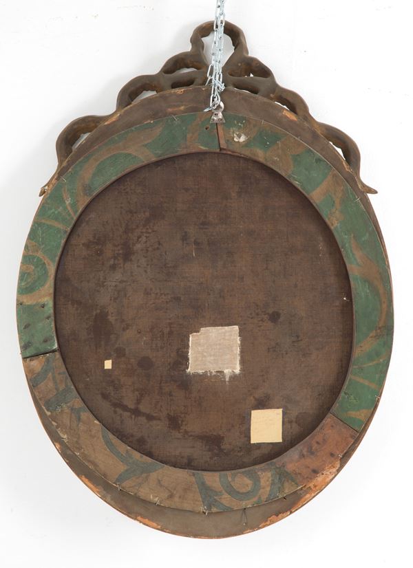 Dipinto ovale olio su tela raffigurante "PUTTI". In cornice intagliata e dorata. Fine XVIII secolo. Difetti, rotture e restauri.