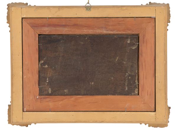 Dipinto olio su tavoletta raffigurante "PAESAGGIO BOSCHIVO CON CERBIATTO". XIX secolo. In cornice intagliata, dorata e con applicazioni in pastiglia. Difetti.