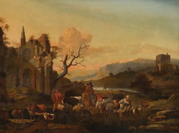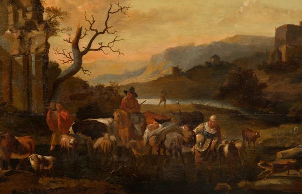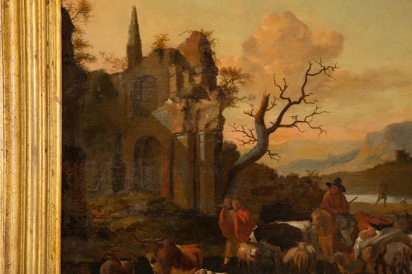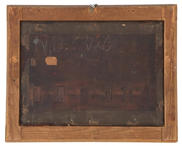 Dipinto olio su tavola raffigurante "PAESAGGIO BUCOLICO". Fine XVIII-inizi XIX secolo. In cornice dorata. Difetti e restauri.