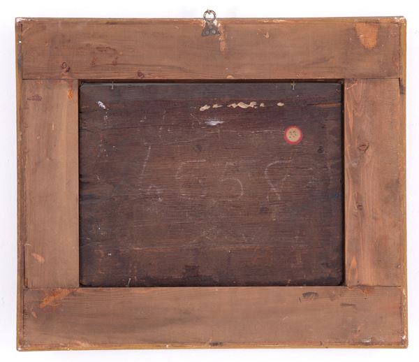 Dipinto olio su tavoletta raffigurante "PAESAGGIO CON FIGURE E ANIMALI". XVIII secolo. In cornice intagliata, traforata e dorata. Difetti e restauri.