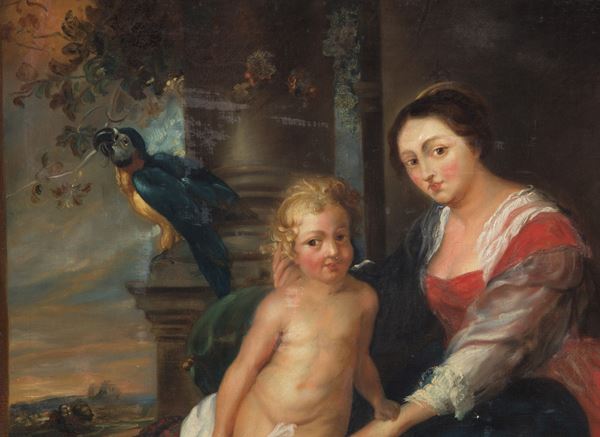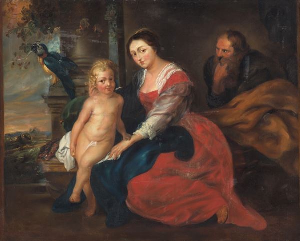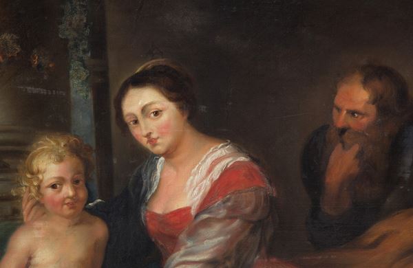 Dipinto olio su tela raffigurante "SACRA FAMIGLIA". XIX secolo. In cornice in legno dorato. Restauri. Già rintelato e rintelaiato.