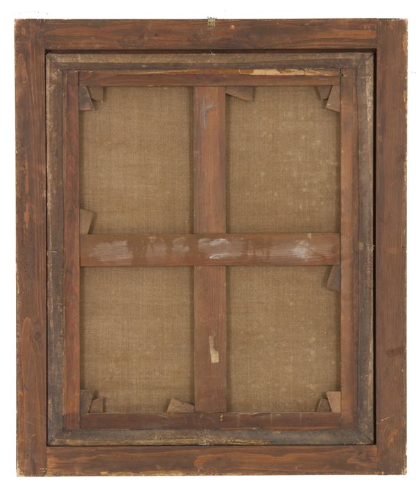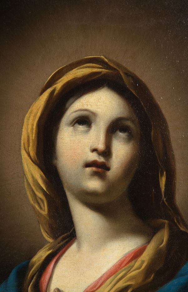 Dipinto olio su tela raffigurante "SANTA IN ESTASI". Fine XVII-inizi XVIII secolo. In cornice intagliata e dorata non coeva. Restauri. Già rintelato e rintelaiato.