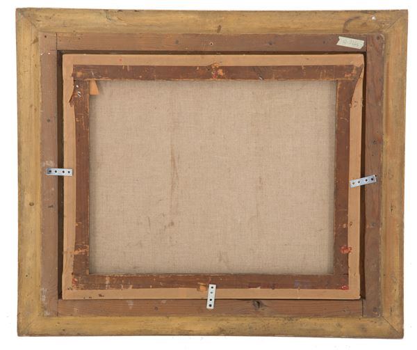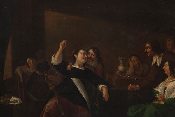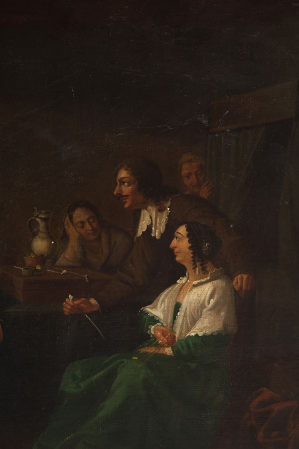 Dipinto olio su tela raffigurante "SCENA D'INTERNO". Fine XVII secolo. In cornice in legno intagliato e dorato. Lievi restauri. Già rintelato e rintelaiato. In cornice.