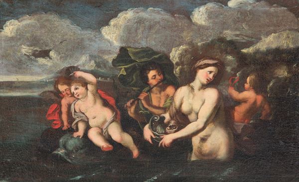 SCUOLA FIAMMINGA DELLA FINE DEL XVII-INIZI XVIII SECOLO. Dipinto olio su tela raffigurante "TRIONFO DI GALATEA". In cornice in legno dipinto. Restauri. Già rintelato e rintelaiato.