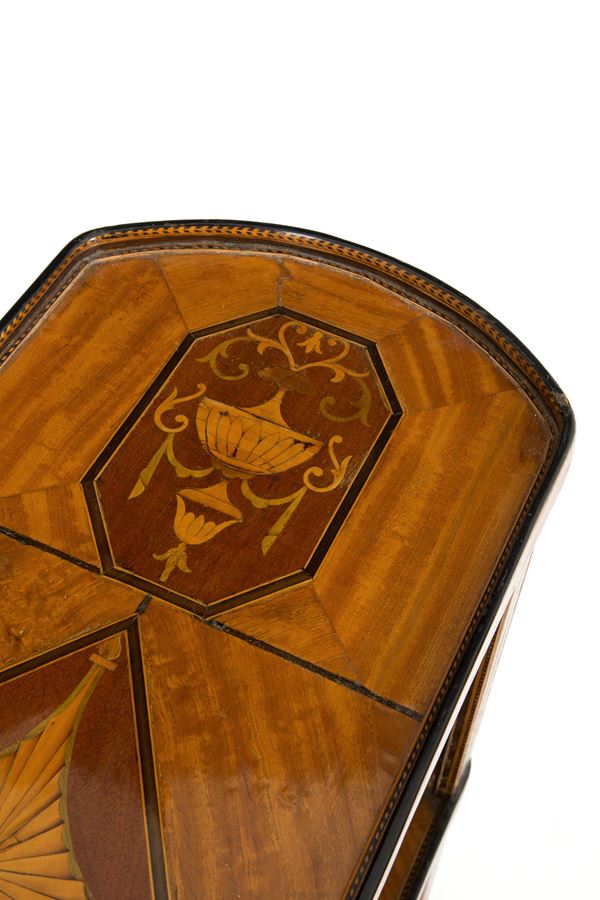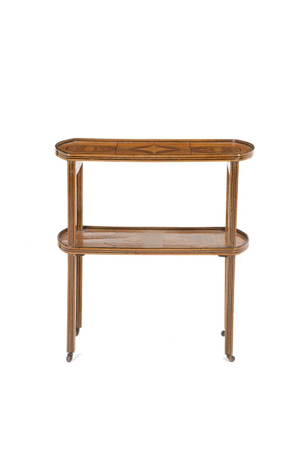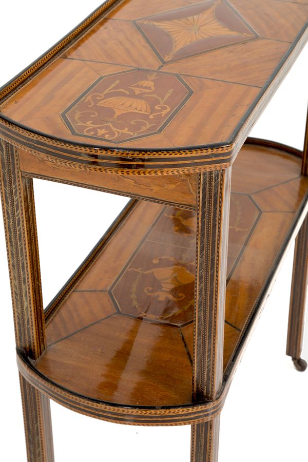 Etagere intarsiato in legni vari con motivi geometrici. Inghilterra. XIX secolo. Lievi difetti.