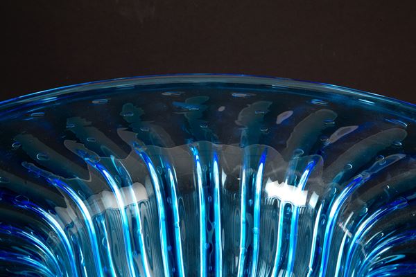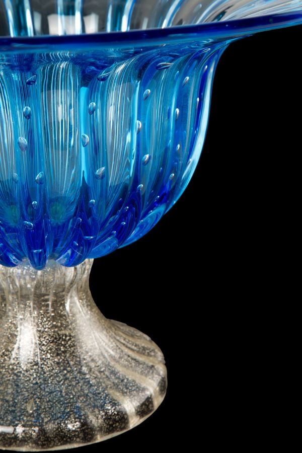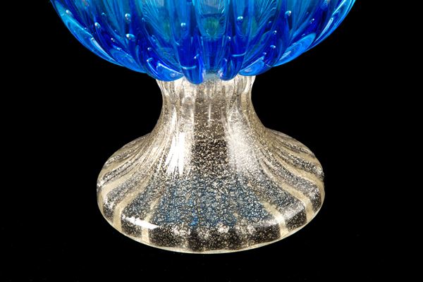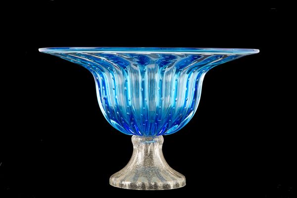 Grande alzata in vetro di Murano nei toni del blu e dell'oro. XX secolo.