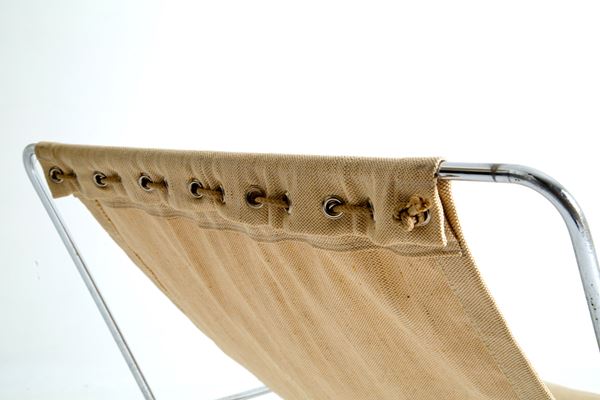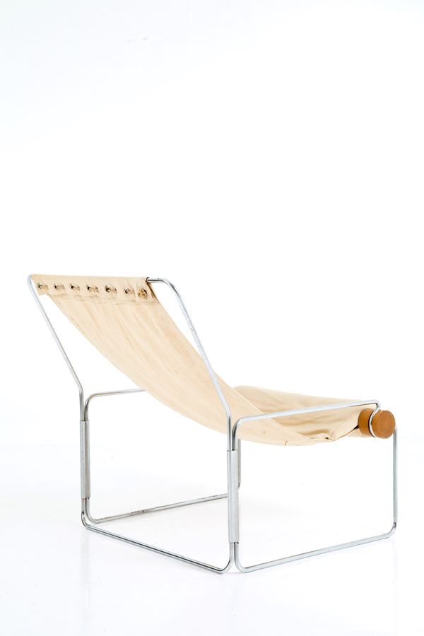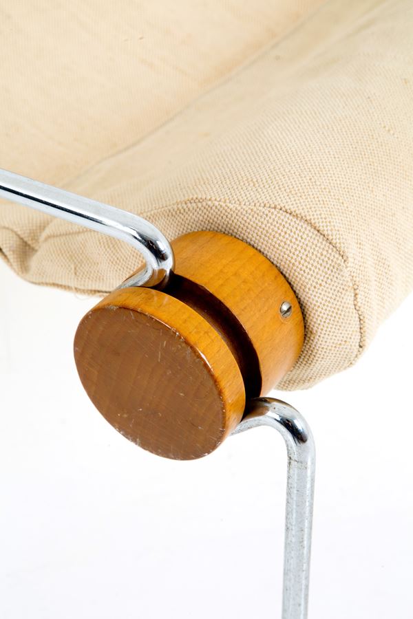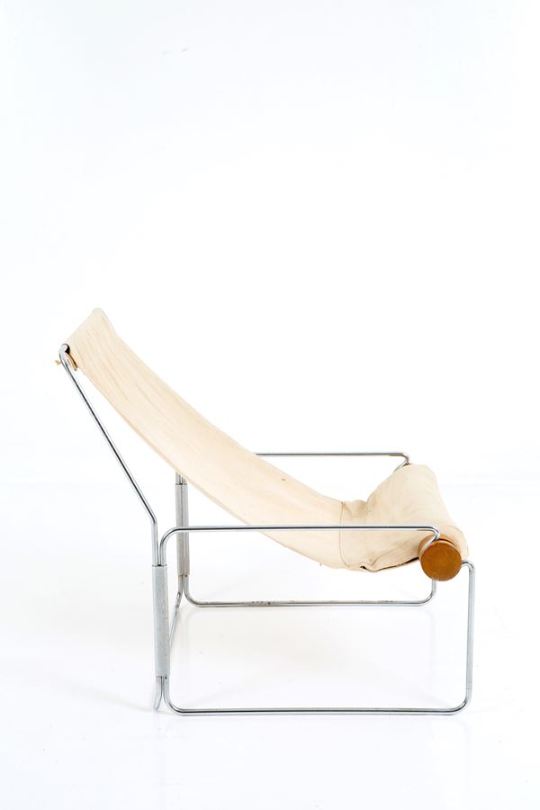 Poltrona pieghevole modello 'Londra 840' in acciaio cromato, legno e tela. Disegnata per Studio Silvio Coppola. Produzione MOBIL ITALIA. Anni '70. Segni di usura del tempo.