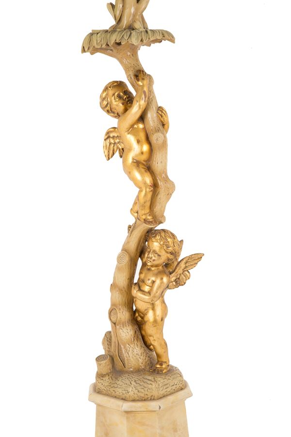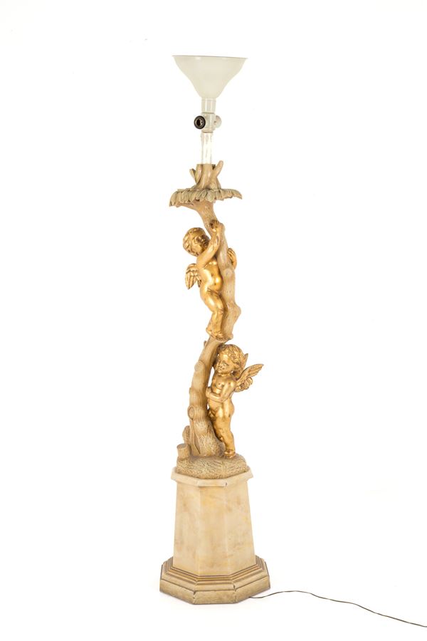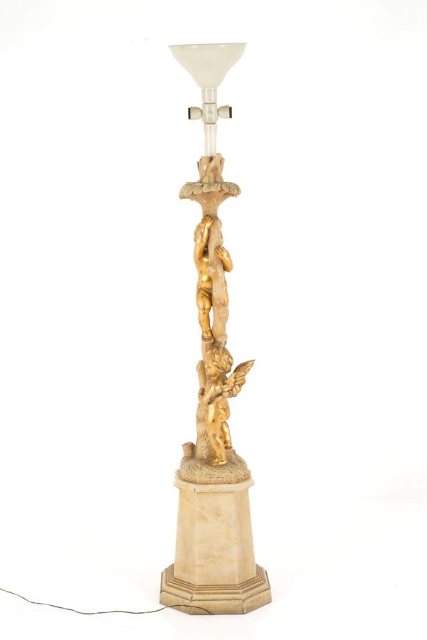 Lampada da terra in legno intagliato con putti. XX secolo. Lievi difetti e piccole mancanze.