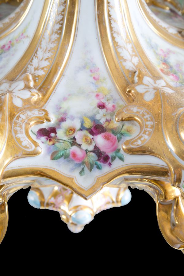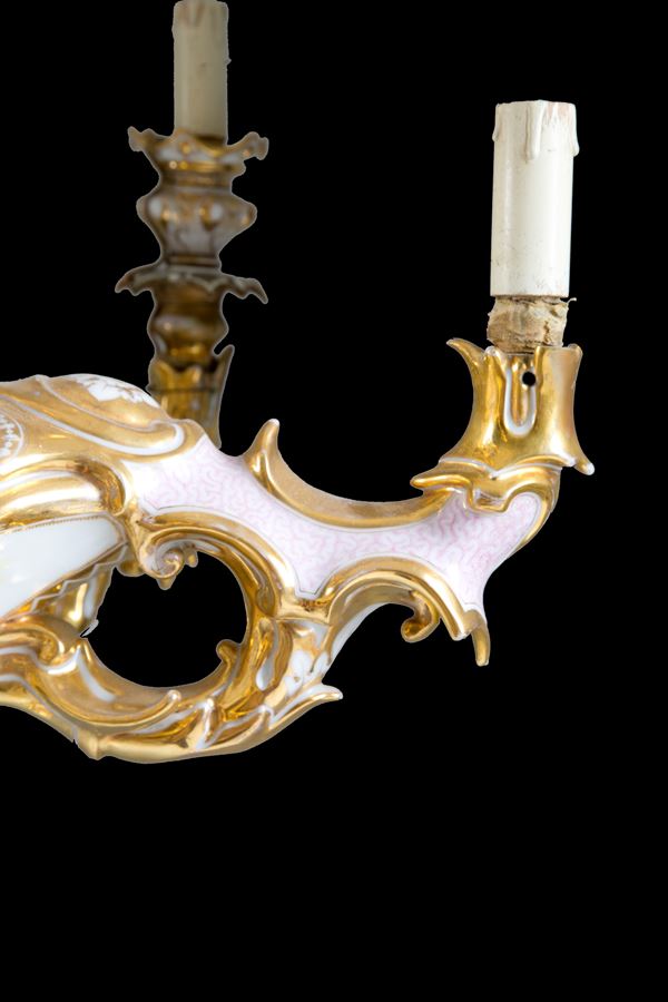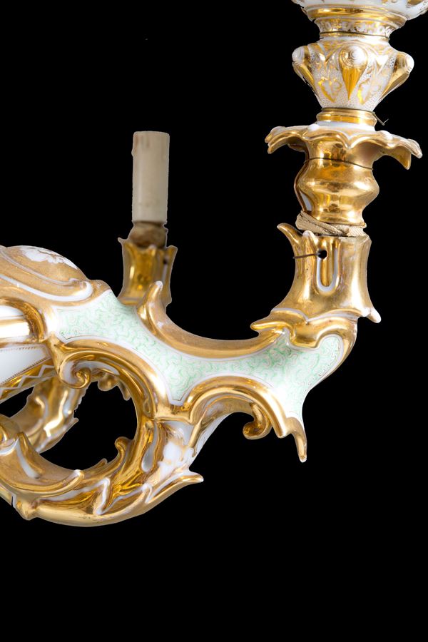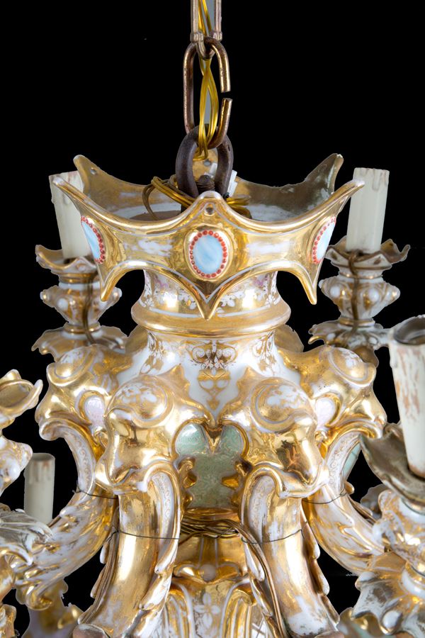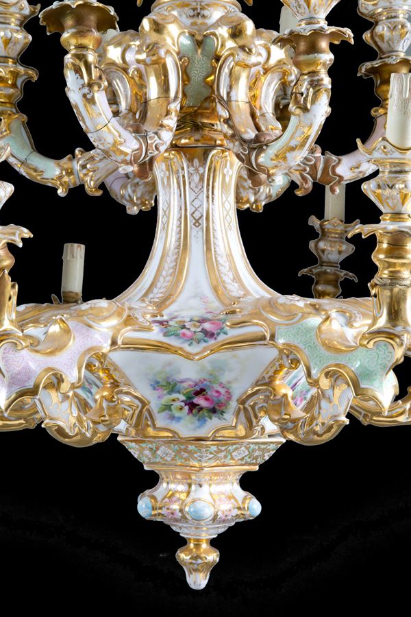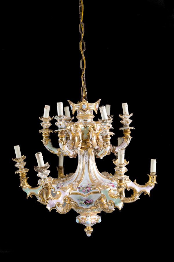 Lampadario dodici luci su due palchi in porcellana lumeggiata in oro e con decori floreali. Fine XIX secolo. Difetti e rotture.