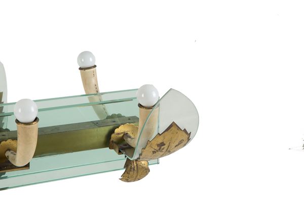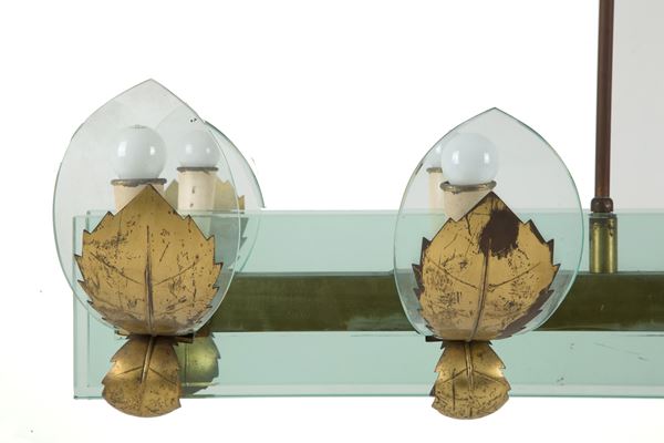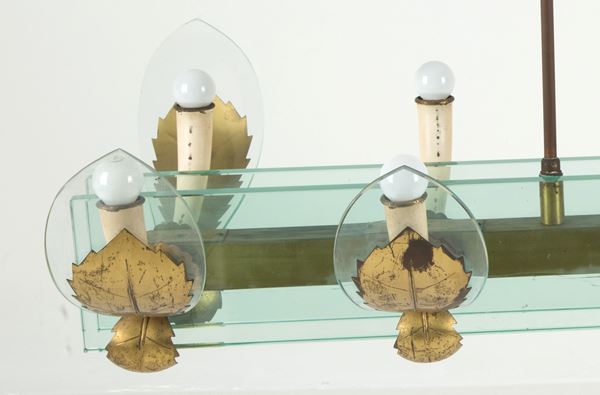 Lampadario dieci luci in vetro e ottone satinato, ottone dorato e ottone verniciato beige. Produzione FONTANA ARTE (Attr.). Difetti e mancanze.