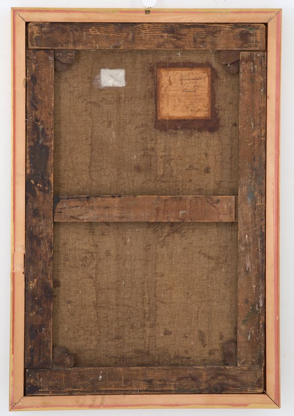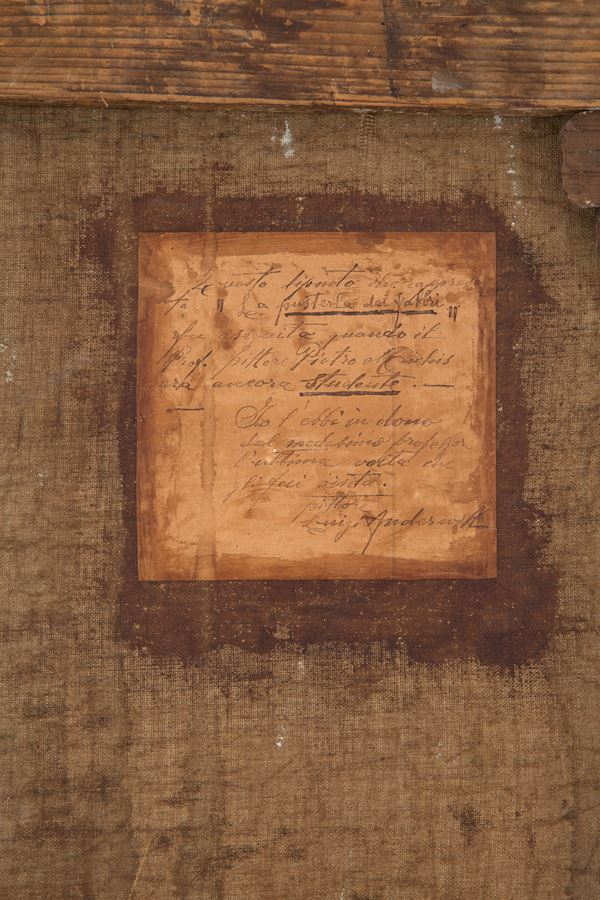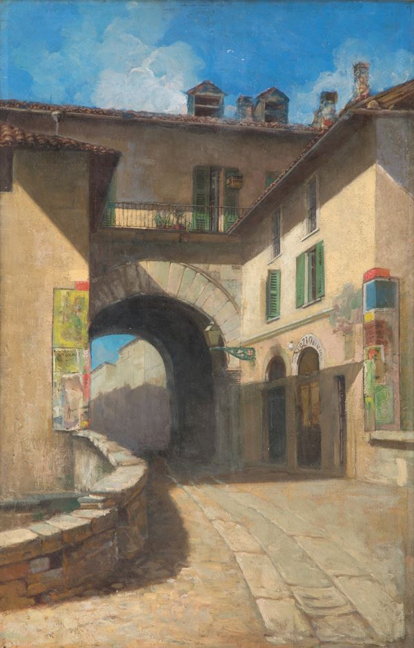 Dipinto olio su tela raffigurante "LA PUSTERIA DEI FABBRI". In cornice. Con autentica di Luigi Anderwill, allievo dell'artista, sul retro.
