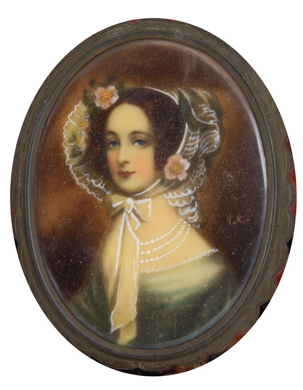 Miniatura raffigurante "RITRATTO DI FANCIULLA". Firmata VULTUR a destra. XIX secolo. In cornice boulle.