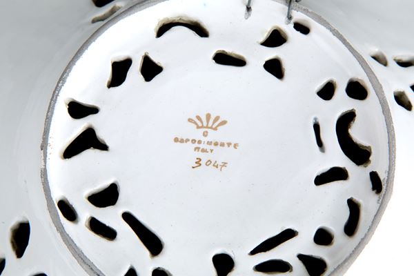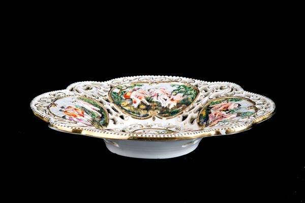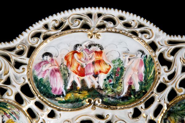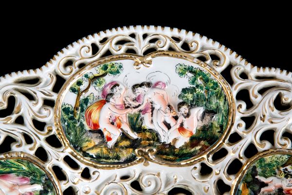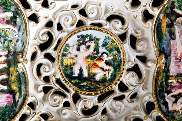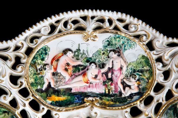 Piatto in ceramica traforata e dipinta a rilievo raffigurante "SCENE MITOLOGICHE". Marcato CAPODIMONTE sul fondo. XX secolo.