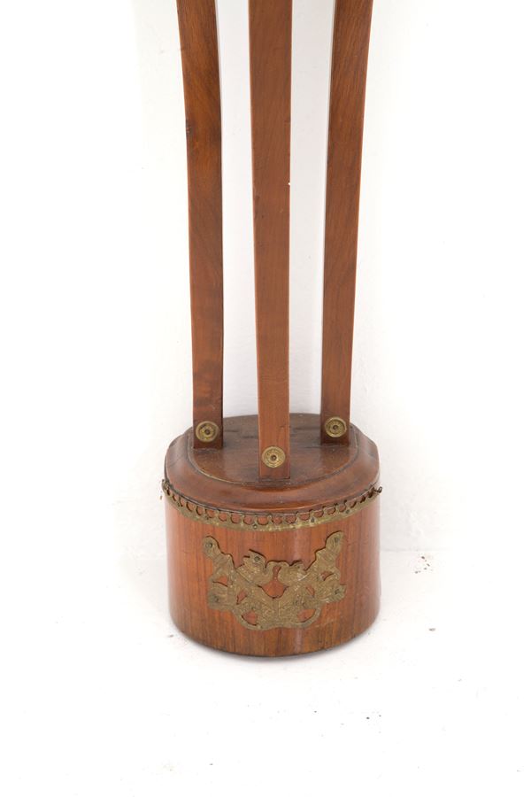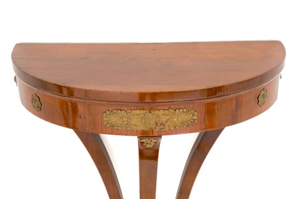 Piccola consolle demilune in legno lastronato con applicazioni in lamierino dorato. XIX secolo. Lievi difetti.