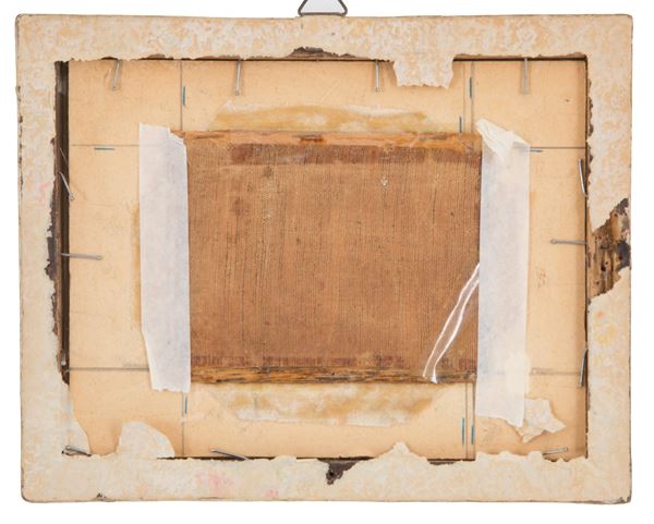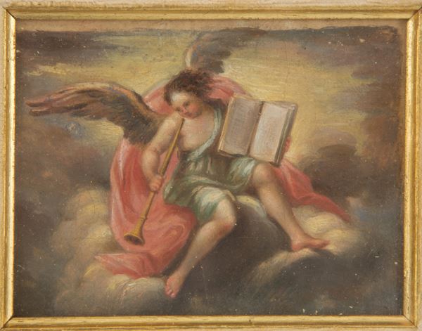 Piccolo dipinto olio su tela raffigurante "ANGELO MUSICANTE". XVIII secolo. In bella cornice in legno intagliato e dorato. Lievi difetti.