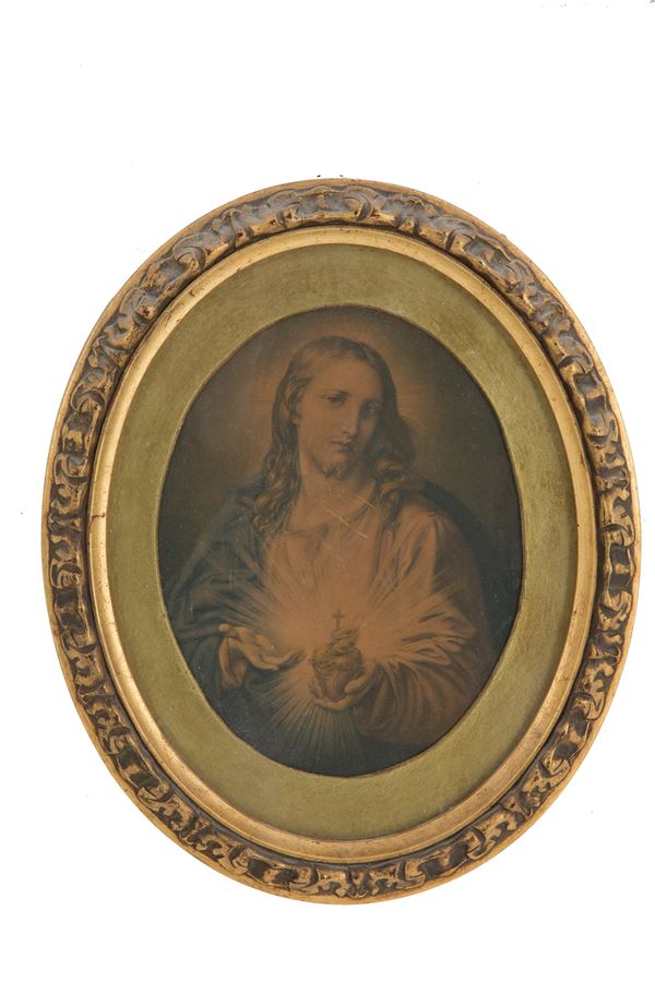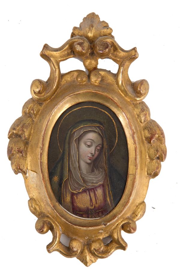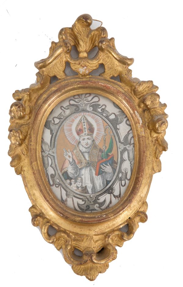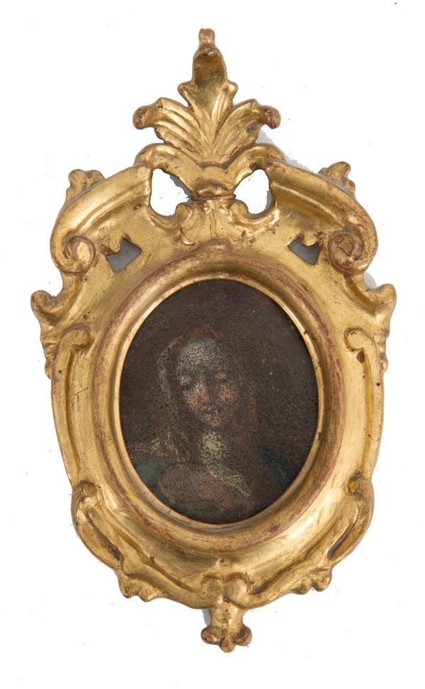 Quattro cornici in legno intagliato e dorato con dipinti a soggetto religioso. XVIII-XIX secolo. Lievi difetti. Misure varie (minima 15x9 cm ca., massima 36x29 cm ca.).