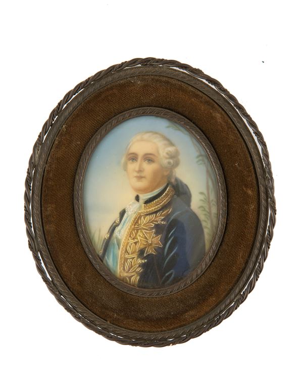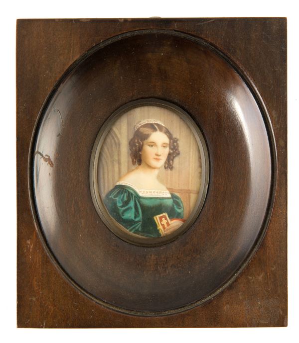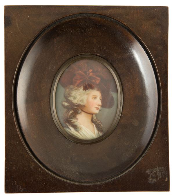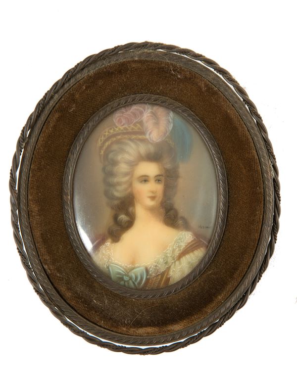 Quattro miniature raffiguranti "RITRATTI DI GENTILUOMINI E GENTILDONNE". Una firmata HERMO in basso a destra. XIX secolo. Due in cornici in legno e due in metallo brunito e velluto.