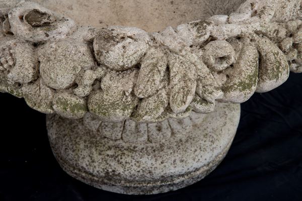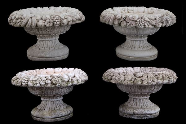 Quattro vasi in agglomerato di pietra con ghirlande di frutta. Difetti.