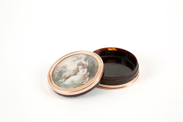 Scatoletta in oro rosa con miniatura raffigurante "FANCIULLA CON PECORELLA" sul coperchio. XIX secolo. Lievi difetti.