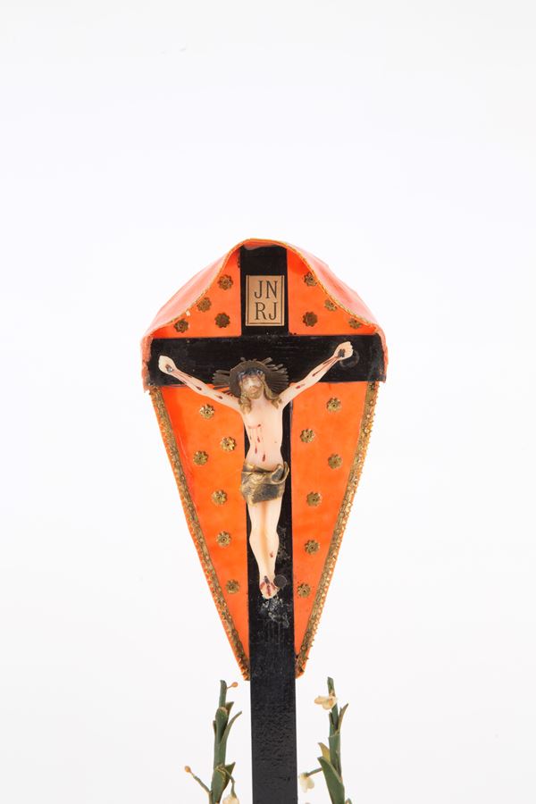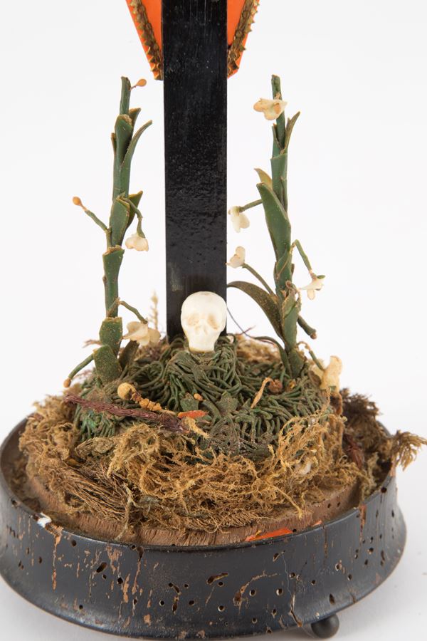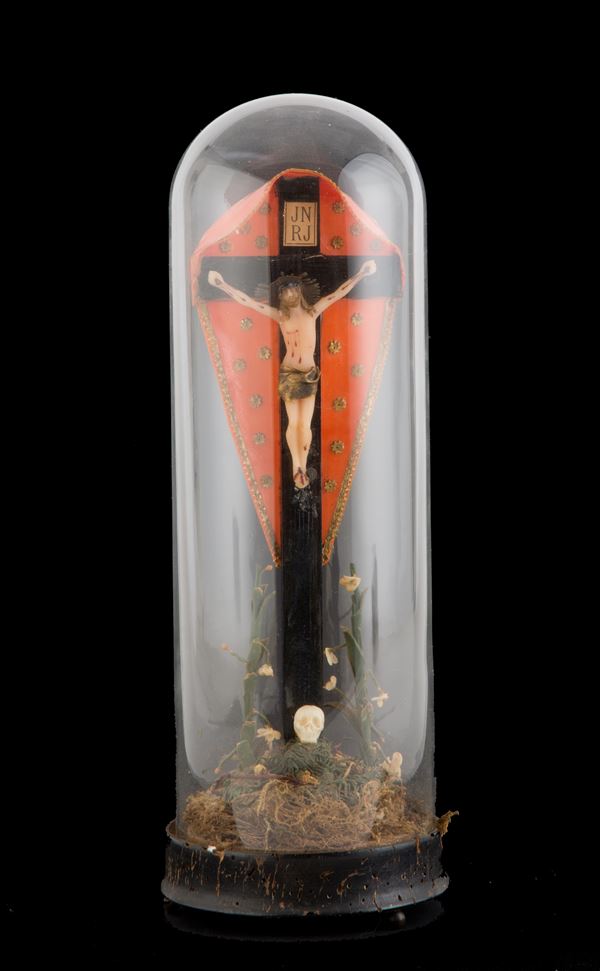 Scultura in legno e cera raffigurante "CROCIFISSIONE". XIX Secolo. Sotto campana di vetro. Difetti.