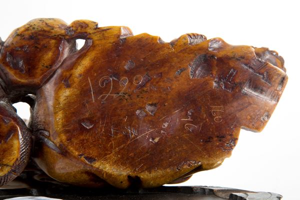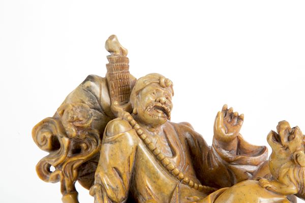 Scultura in pietra saponaria raffigurante "SAGGIO CON CANE DI FO". Base in legno. Cina. Lievi difetti.