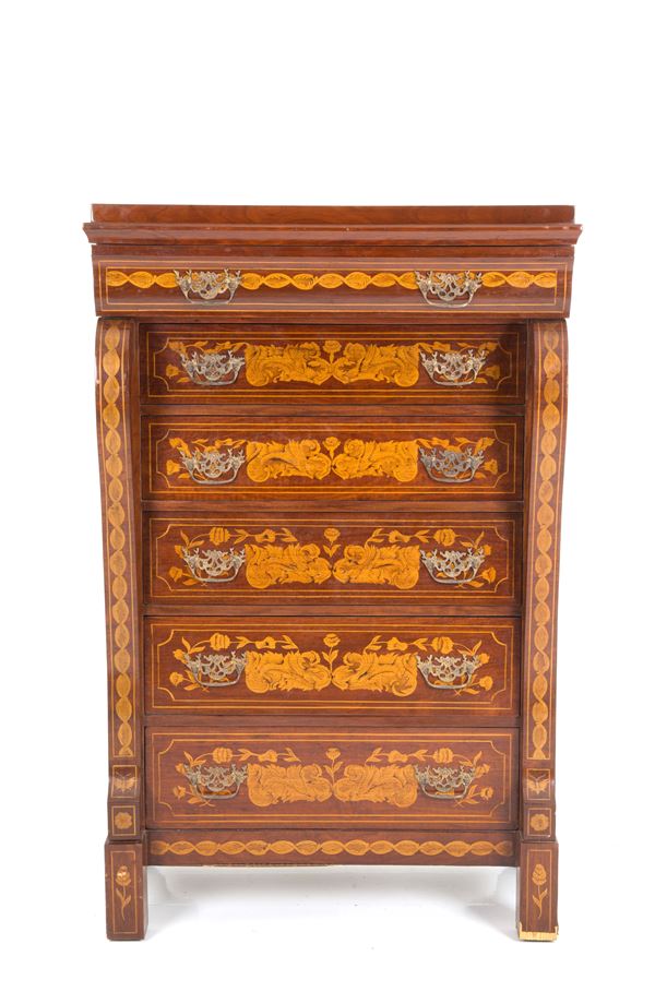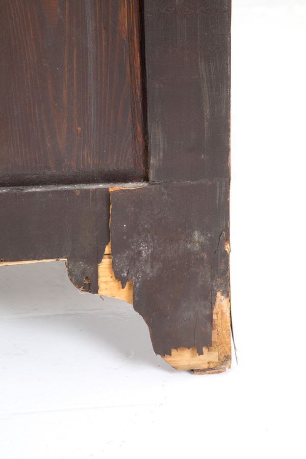 Secretaire a sei cassetti in legno dipinto e pirografato con lesene a cravatta e maniglie in ferro patinato. XIX secolo. Difetti e mancanze.