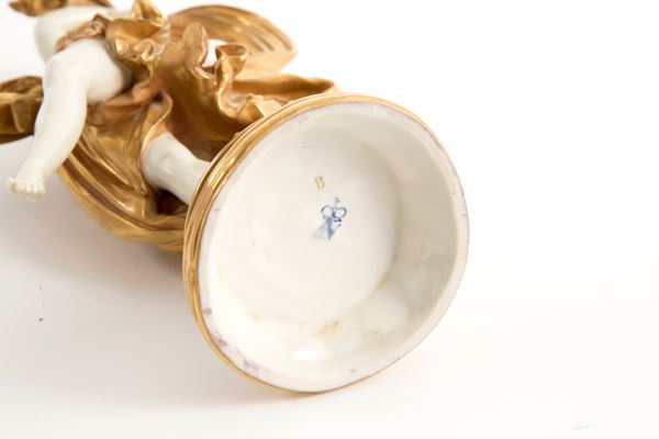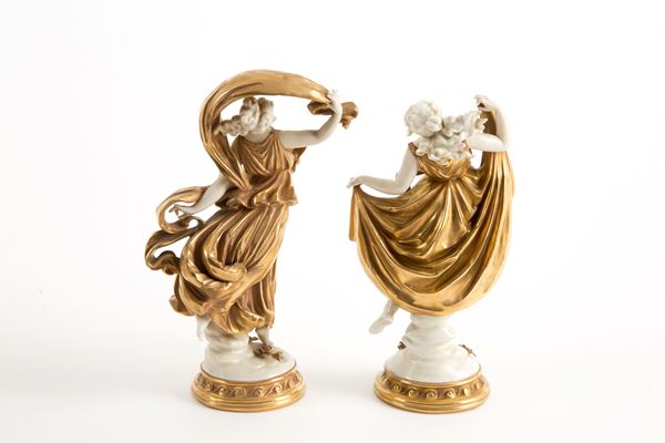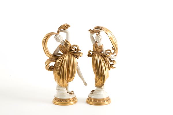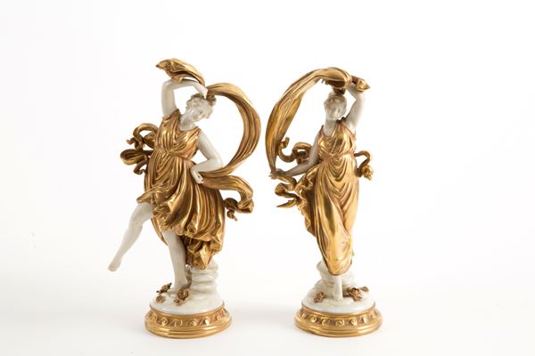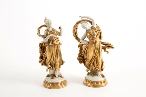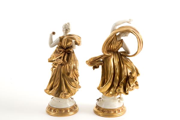 Sei statuine in porcellana bianca e oro raffiguranti "DANZATRICI". Marcate sotto la base. XIX secolo.