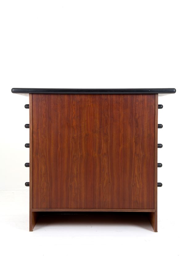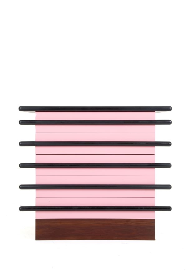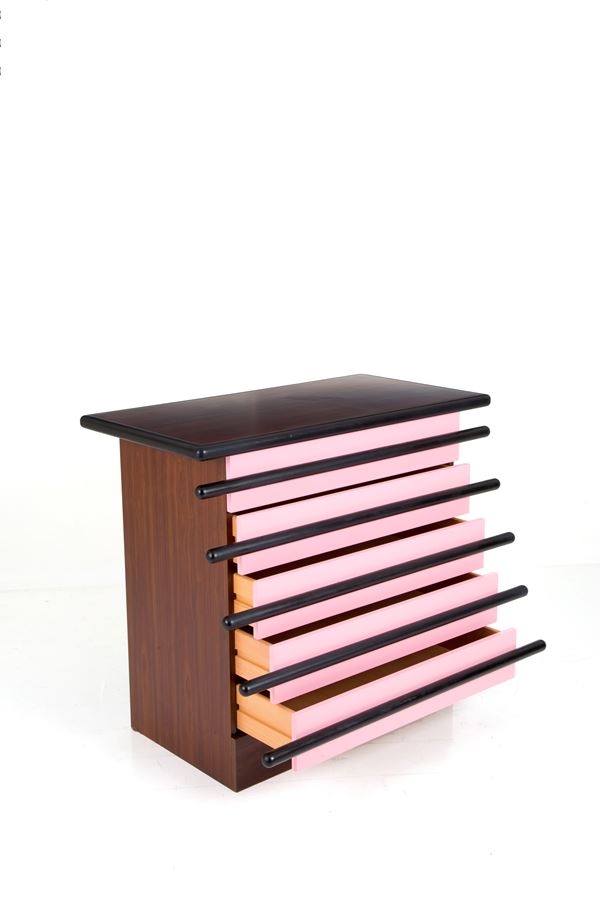 Cassettiera Bastonio a cinque cassetti in legno, legno tinto e legno laccato rosa. Produzione POLTRONOVA. Segni di usura del tempo.