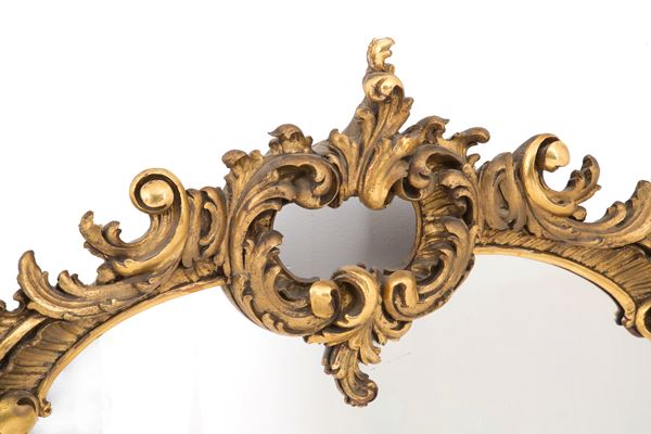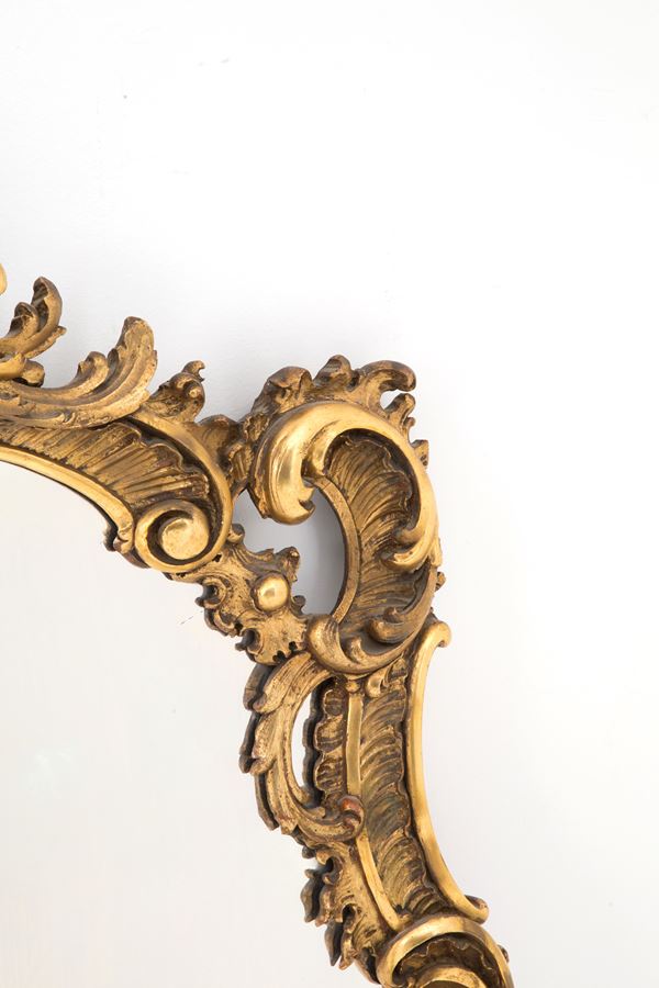 Specchiera in legno intagliata e dorata. XX secolo. Lievi difetti.