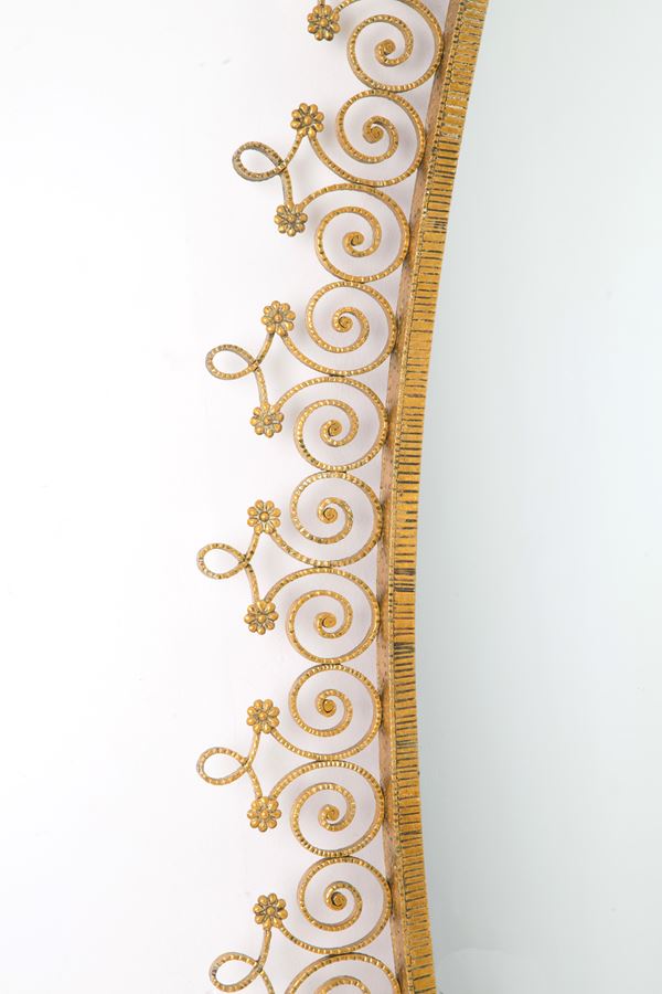Specchiera ovale in ferro lavorato e dorato. Lievi difetti alla doratura.