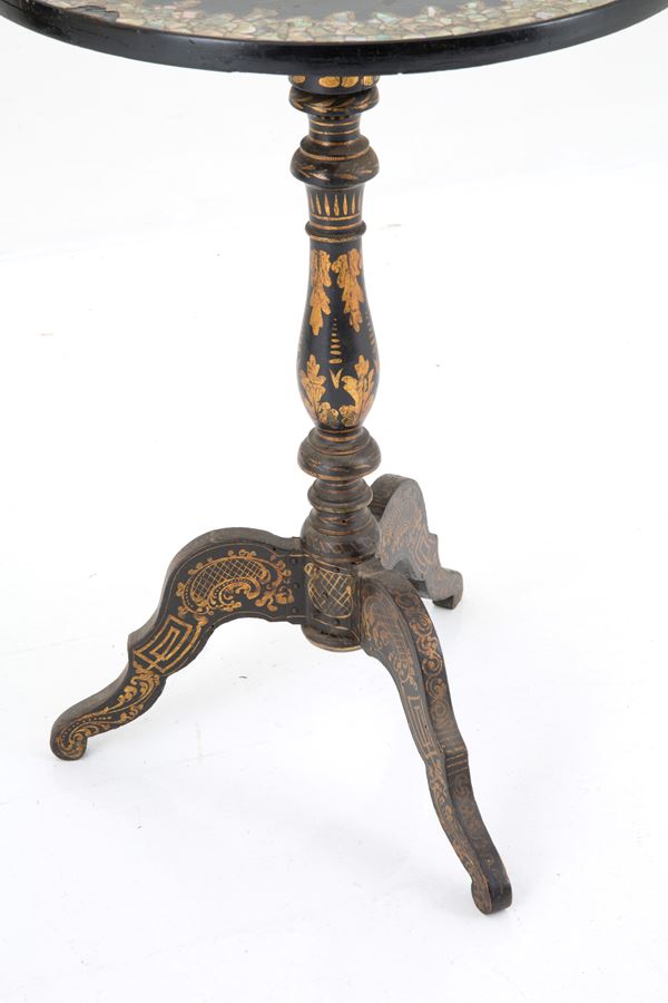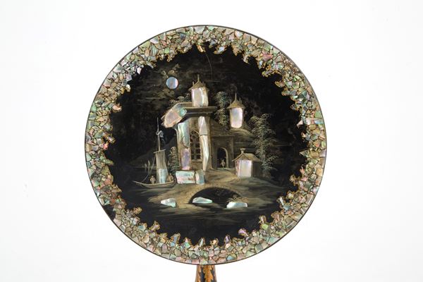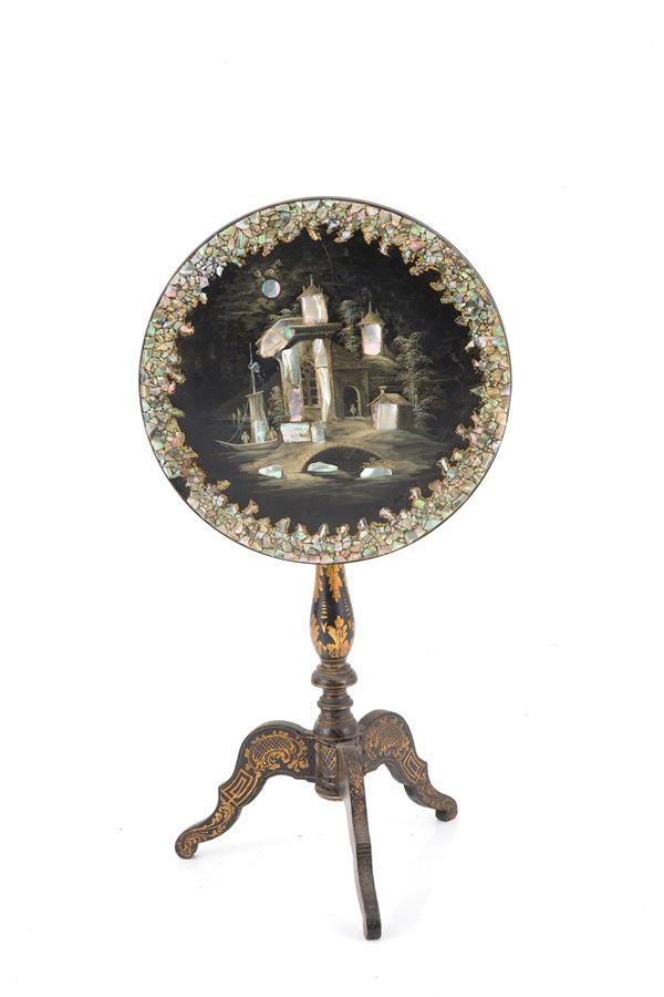Tavolino a vela in legno laccato e dipinto con paesaggio fluviale e intarsi in madreperla sul piano. Base tornita con piede tripode. XIX secolo. Difetti e restauri.