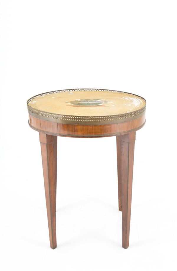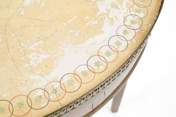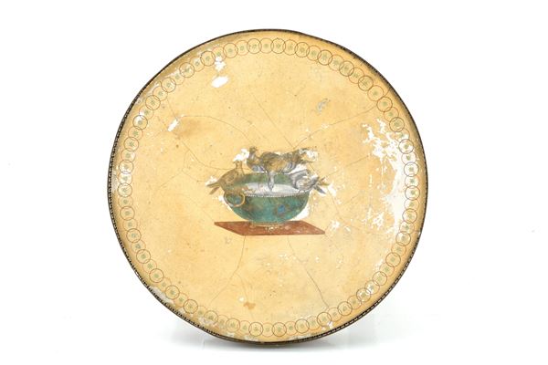 Tavolino in legno con guarnizioni in ottone, piano in scagliola dipinta con colombe che bevono. XIX secolo. Difetti e rotture.