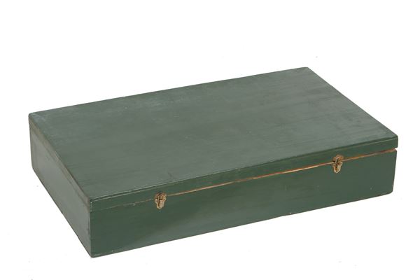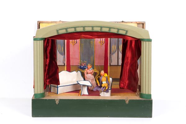 Teatrino componibile con quindici personaggi in gesso dipinto e stoffa e due scenari intercambiabili. Napoli. XX secolo. In cassa in legno laccato. Difetti.