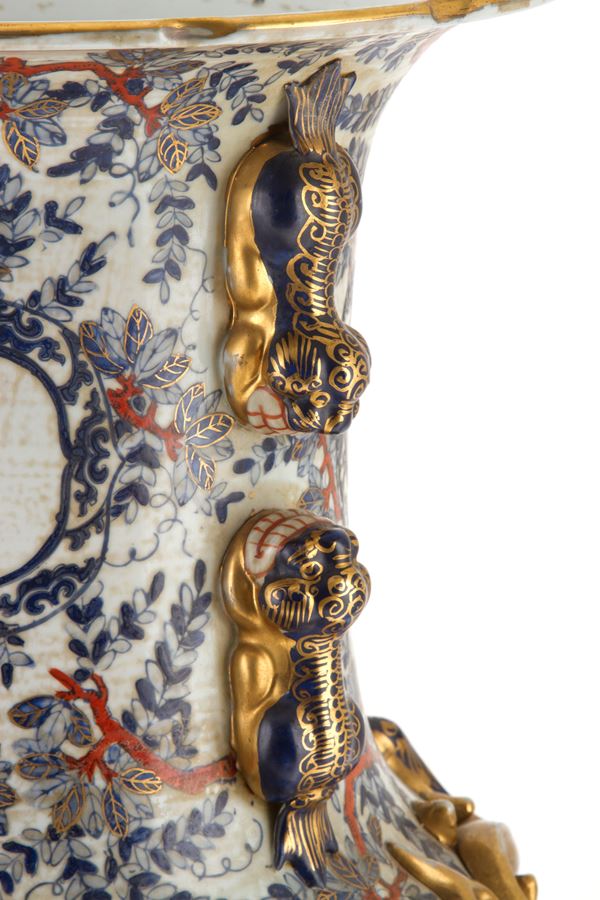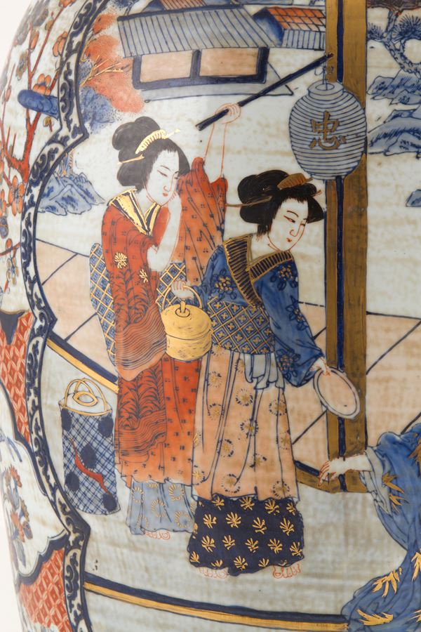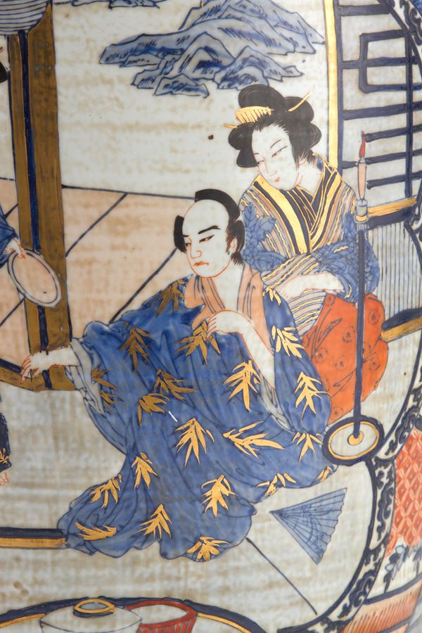 Vaso in porcellana a motivi di vita orientale. Su base in legno. Giappone.