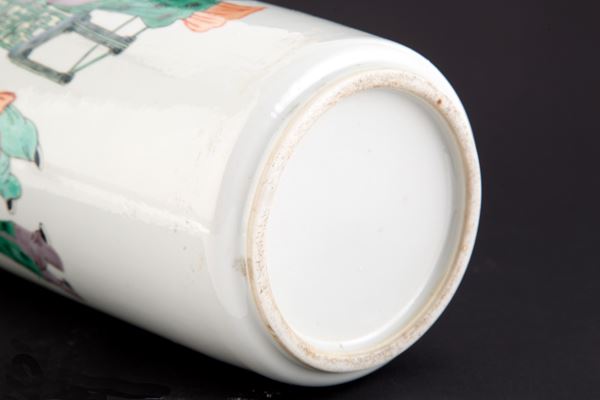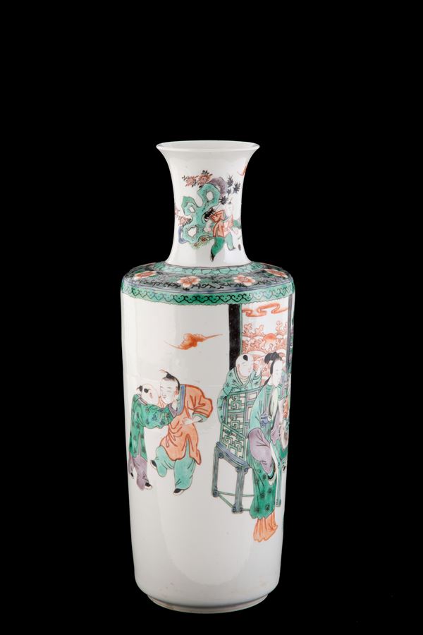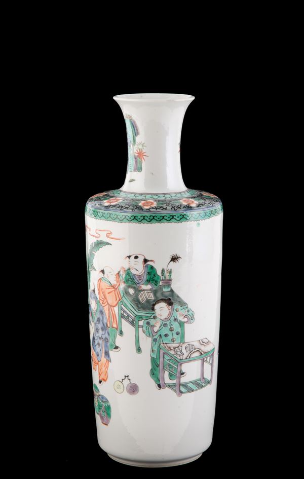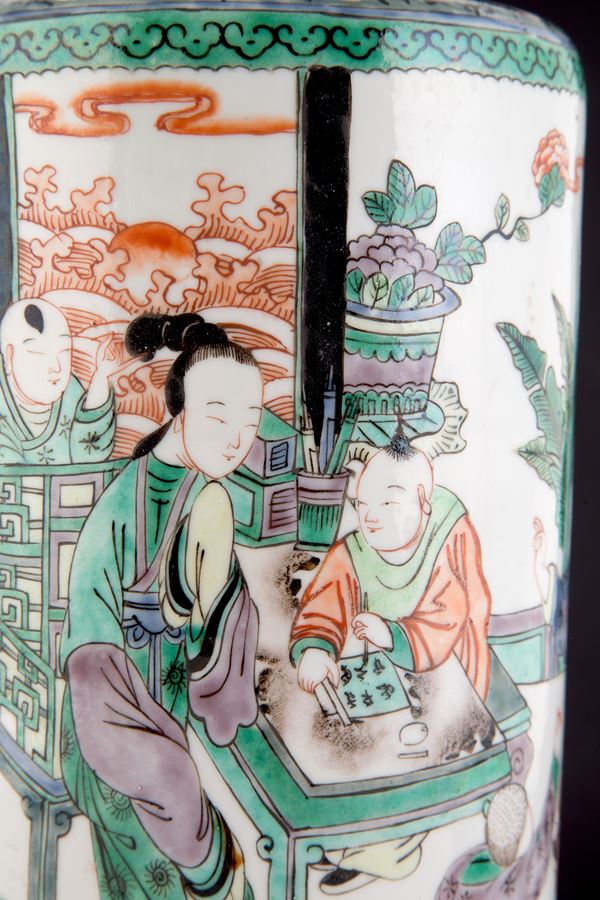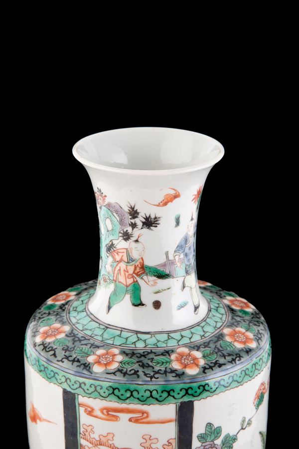Vaso in porcellana Famiglia Verde raffigurante "SCENE DI VITA ORIENTALE". Cina. Lieve felatura.