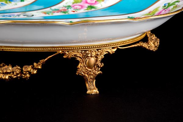 Vassoio in porcellana dipinta poggiante su base in bronzo cesellato e dorato. Marcato LIMOGES. Fine XIX- inizi XX secolo.