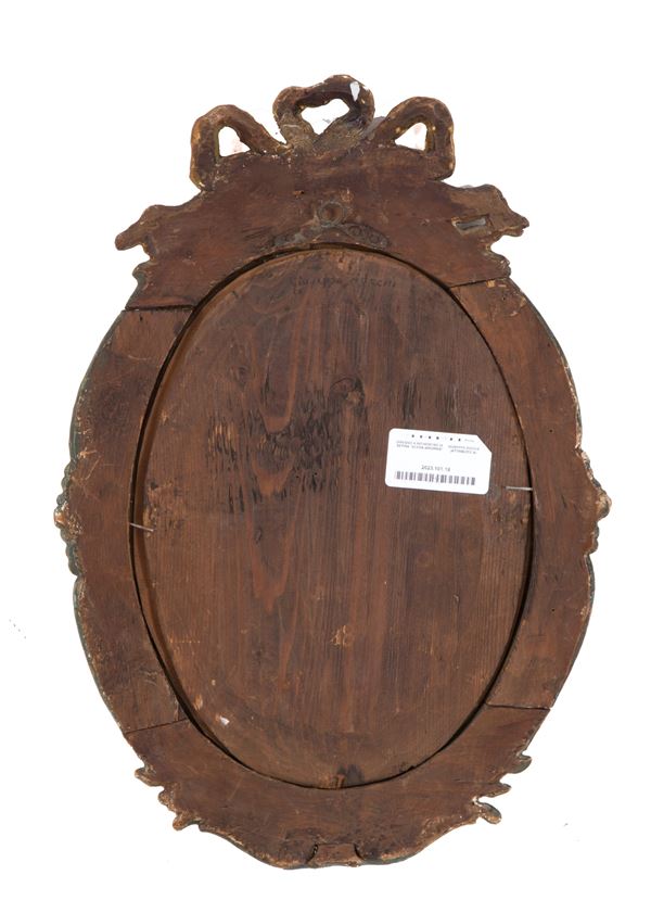 Disegno a inchiostro di seppia su carta raffigurante "SCENA AMORINA". Veneto. In cornice in legno intagliata, laccata e dipinta.