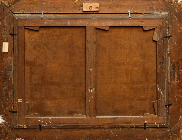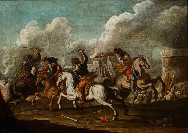 SCUOLA NAPOLETANA DEL XVII SECOLO. Dipinto olio su tela "BATTAGLIA CON CAVALLI". In cornice intagliata e dorata. Difetti e restauri. Già rintelato e rintelaiato.