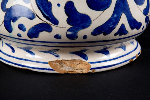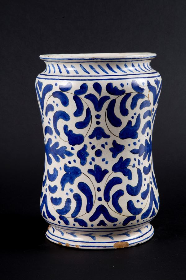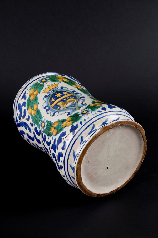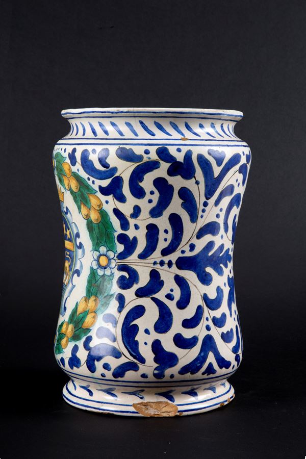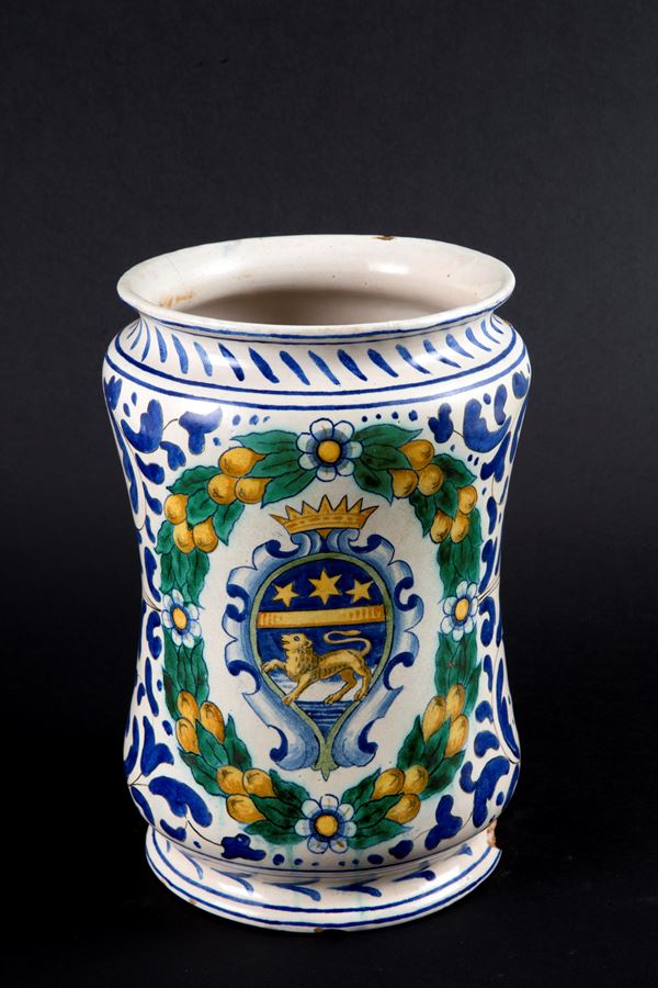 Albarello in maiolica dipinta con stemma nobiliare entro ghirlanda al centro. Faenza. Inizi XIX secolo. Difetti.