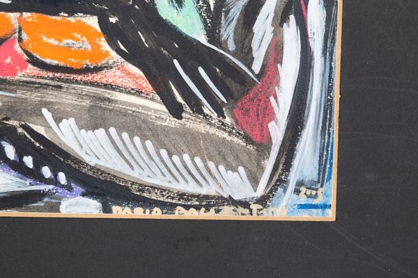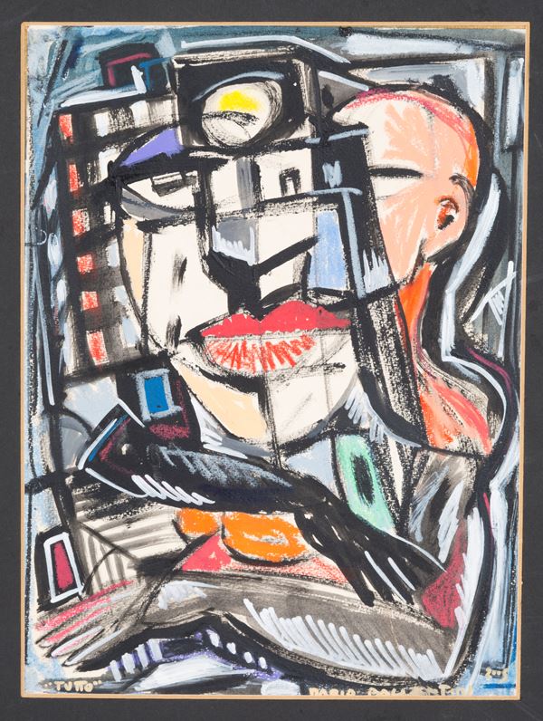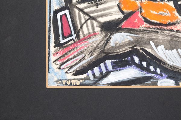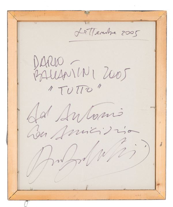 Tecnica mista su carta intitolata "TUTTO". Firmata, datata 2005 in basso a destra e intitolata in basso a sinistra. Controfirmata, datata, intitolata e con dedica sul retro del cartoncino. In cornice.