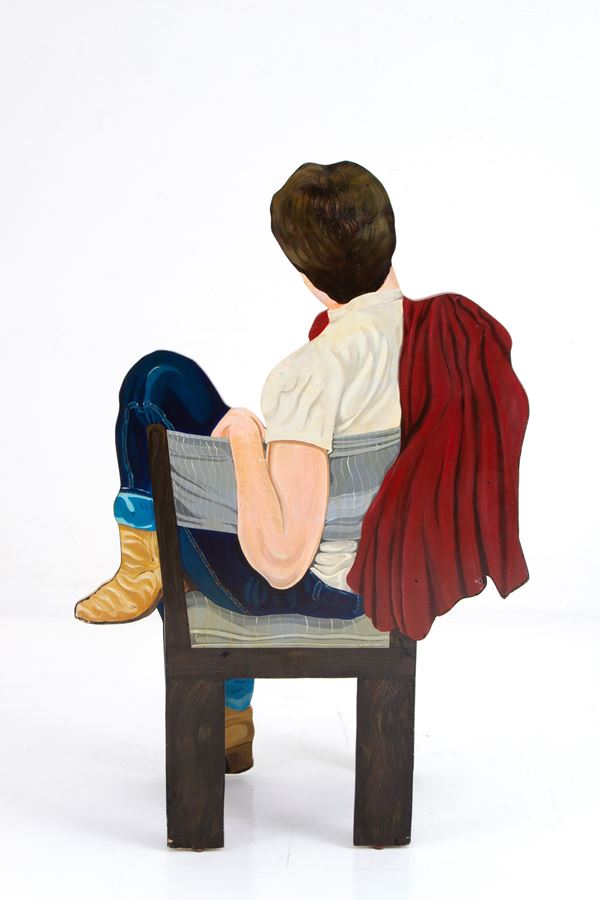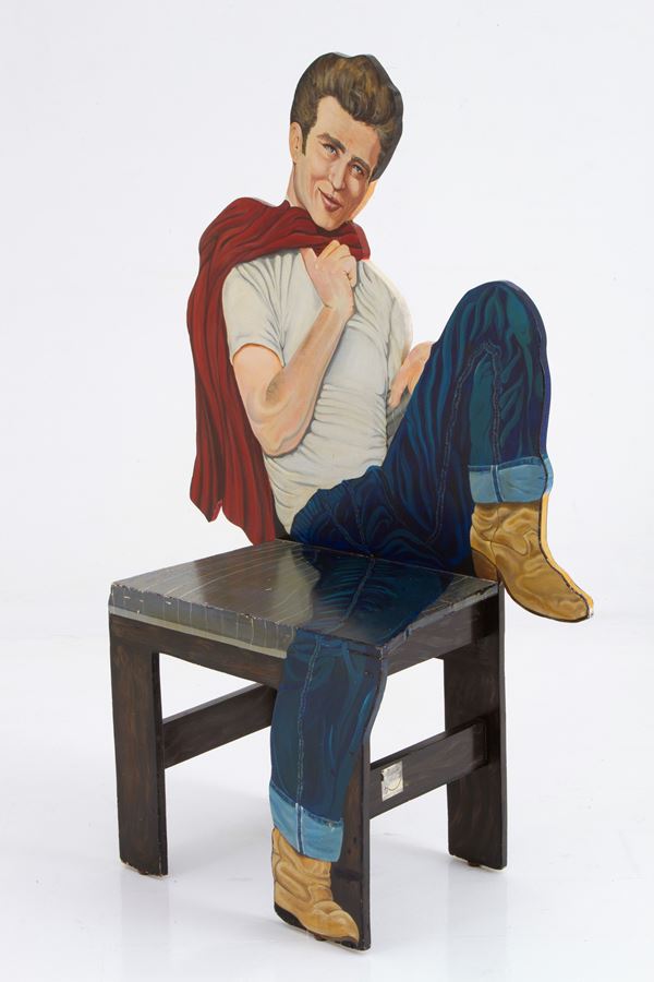 Sedia in legno dipinto raffigurante "JAMES DEAN". Firmata e datata 1989 sul retro. Lievi segni di usura del tempo.