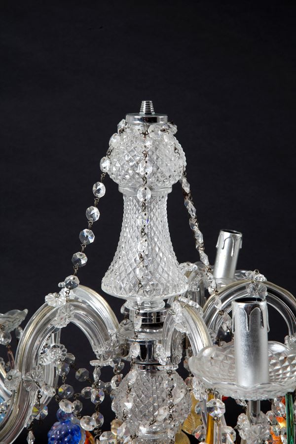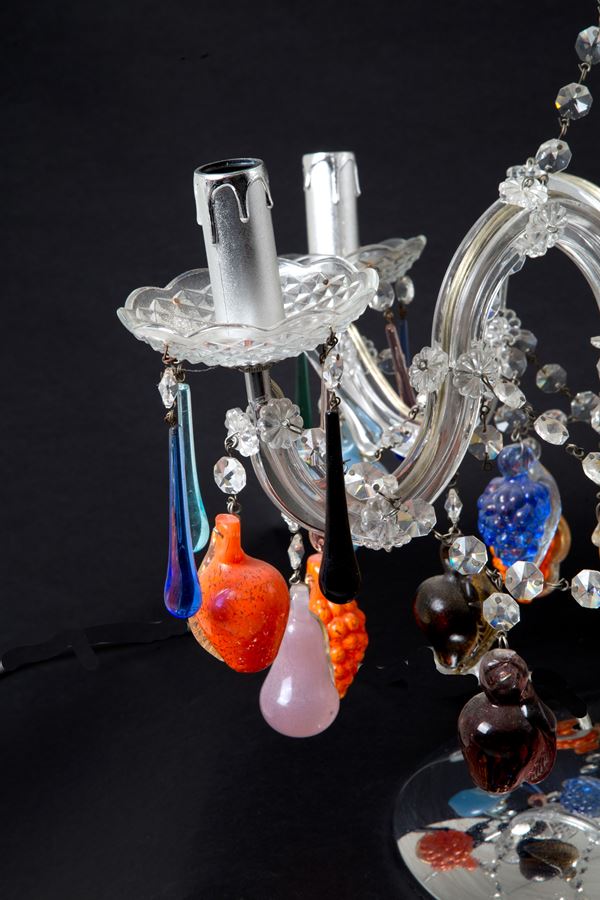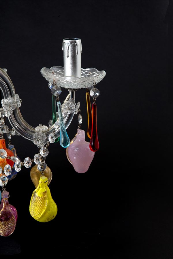 Candelabro cinque luci in vetro di Murano con pendagli colorati a forma di frutta. XX secolo.