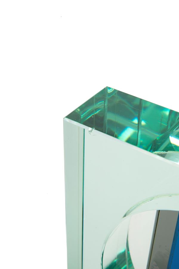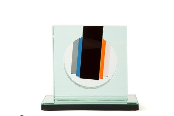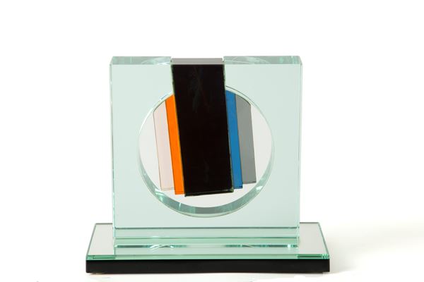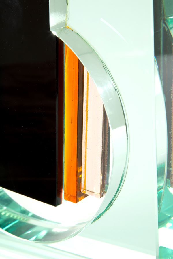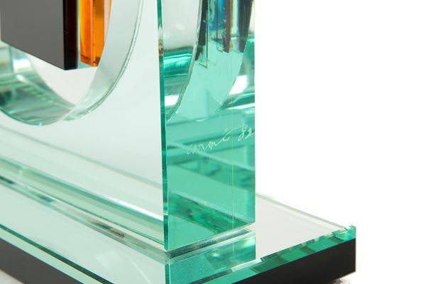Scultura in vetro raffigurante "SOGGETTO INFORMALE". Firmata e datata '82 sul lato. Lievi difetti.
