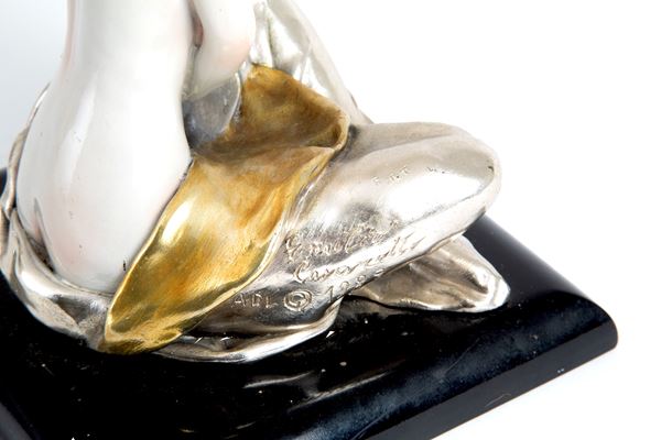 Scultura in argento porcellanato raffigurante "FIGURA FEMMINILE SEDUTA". Firmata e datata 1989 in basso a sinistra. Base in legno ebanizzato.