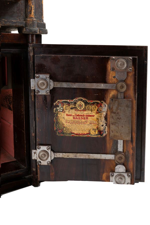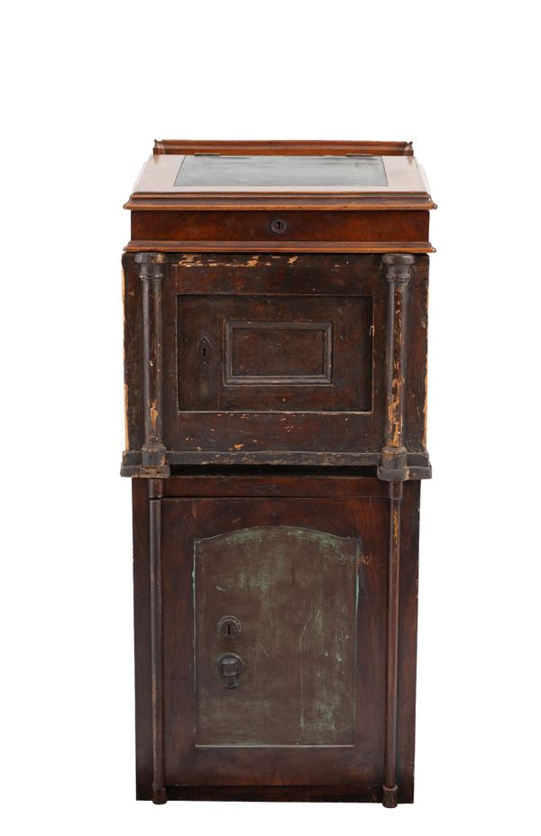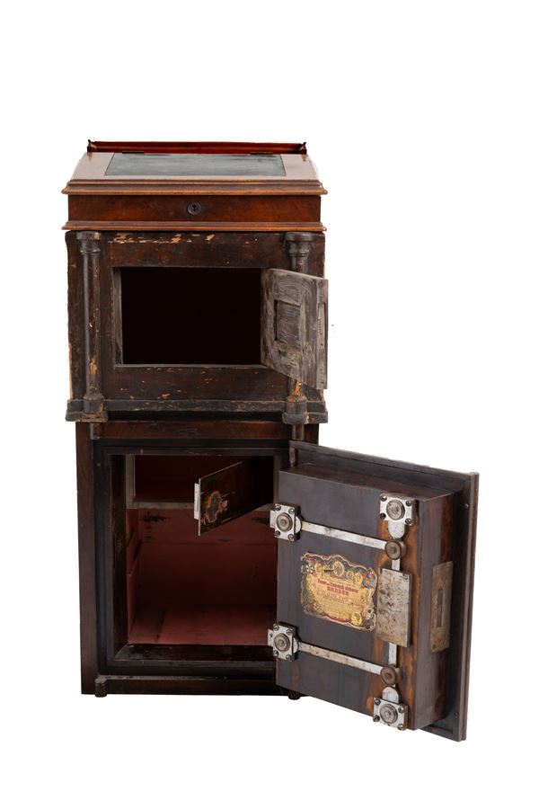 Cassaforte a tre moduli sovrapposti, quello inferiore in ferro e i due superiori in legno, con inserto dello scrittoio in pelle. Produzione F. WERTHEIM & C., Wien. Fine XIX secolo.