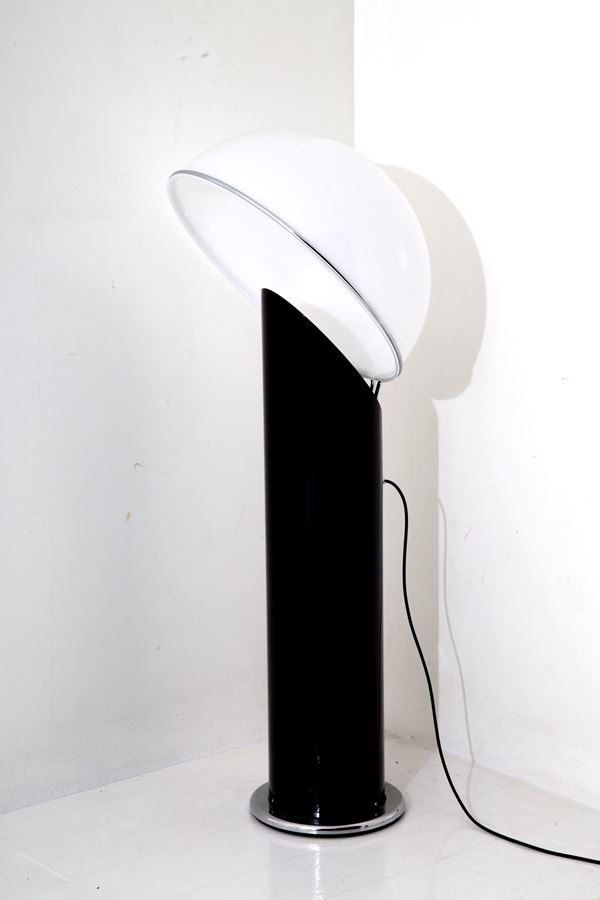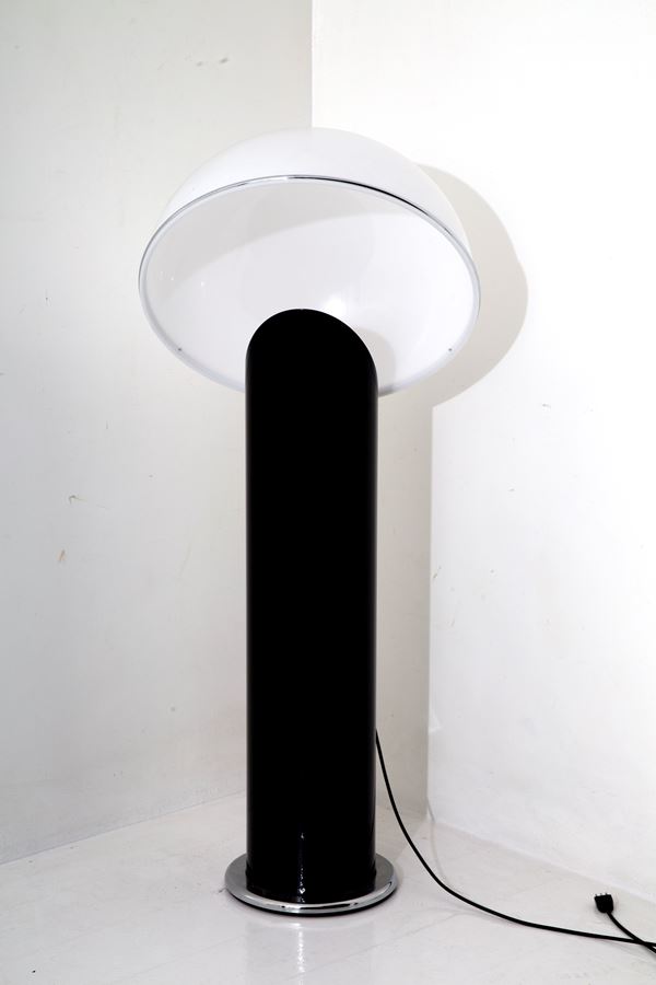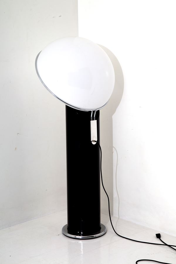 Lampada da terra Ciot con struttura in resina nera, paralume in metacrilato opalino, base e rifiniture in metallo cromato. Produzione LUMENFORM. Anni ’70. Segni di usura del tempo.